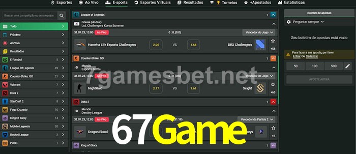 O 67Game oferece uma grande seleção de opções de apostas em e-sports com probabilidades competitivas
